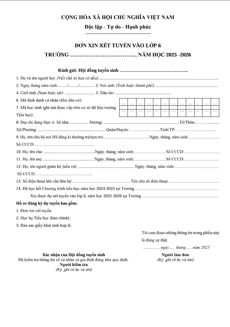 BẤM VÀO ĐÂY ĐỂ TẢI VỀ MẪU ĐƠN XIN DỰ TUYỂN LỚP 6