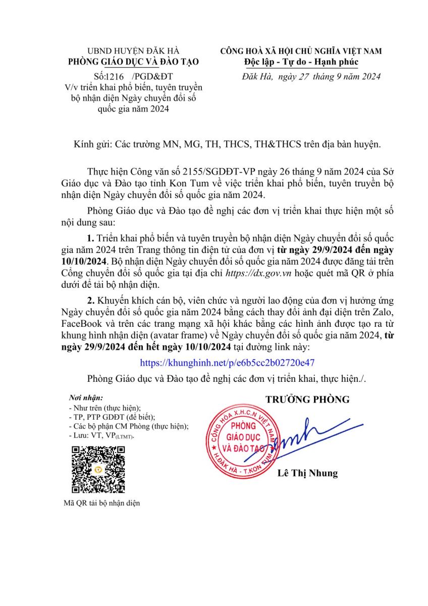 Dưới đây là Công văn 1261/PGD&ĐT ngày 27/09/2024 về việc triển khai phổ biến, tuyên truyền bộ nhận diện Ngày chuyển đổi số quốc gia năm 2024: