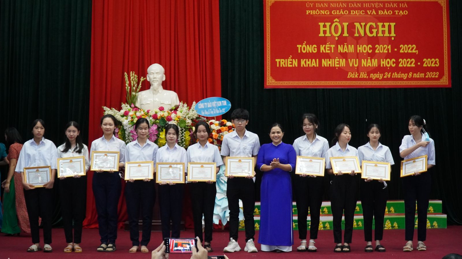 Năm học 2021-2022 với những kết quả đã đạt được, Ngành GDĐT huyện Đăk Hà đã rất vinh dự đón nhận Quyết định của UBND tỉnh về việc công nhận trường đạt chuẩn Quốc gia mức độ 1 cho 06 đơn vị trường; Công nhận trường đạt chuẩn Quốc gia mức độ 2 cho 02 đơn vị trường; Được UBND huyện Đăk Hà tuyên dương, khen thưởng 06 tập thể, có 88 CBGVNV đạt danh hiệu chiến sỹ thi đua cơ sở, 657 cá nhân đạt danh hiệu lao động tiên tiến; có 249 học sinh đạt danh hiệu học sinh giỏi các cấp; nhân dịp này Công ty Bảo hiểm Bảo Việt trao 07 suất học bổng cho các em học sinh có hoàn cảnh đặc biệt khó khăn đạt thành tích xuất sắc trong học tập.